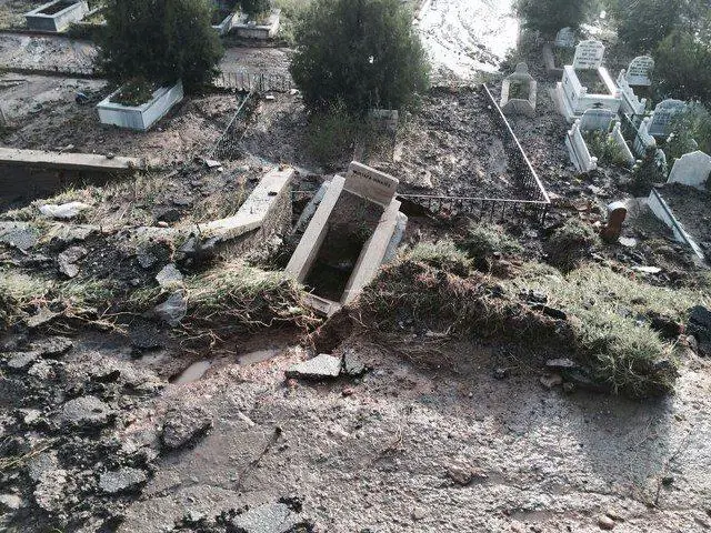 Önceki gün Kırıkkale’de yaşanan sel felaketinde mezarlıklarda hasar gördü.