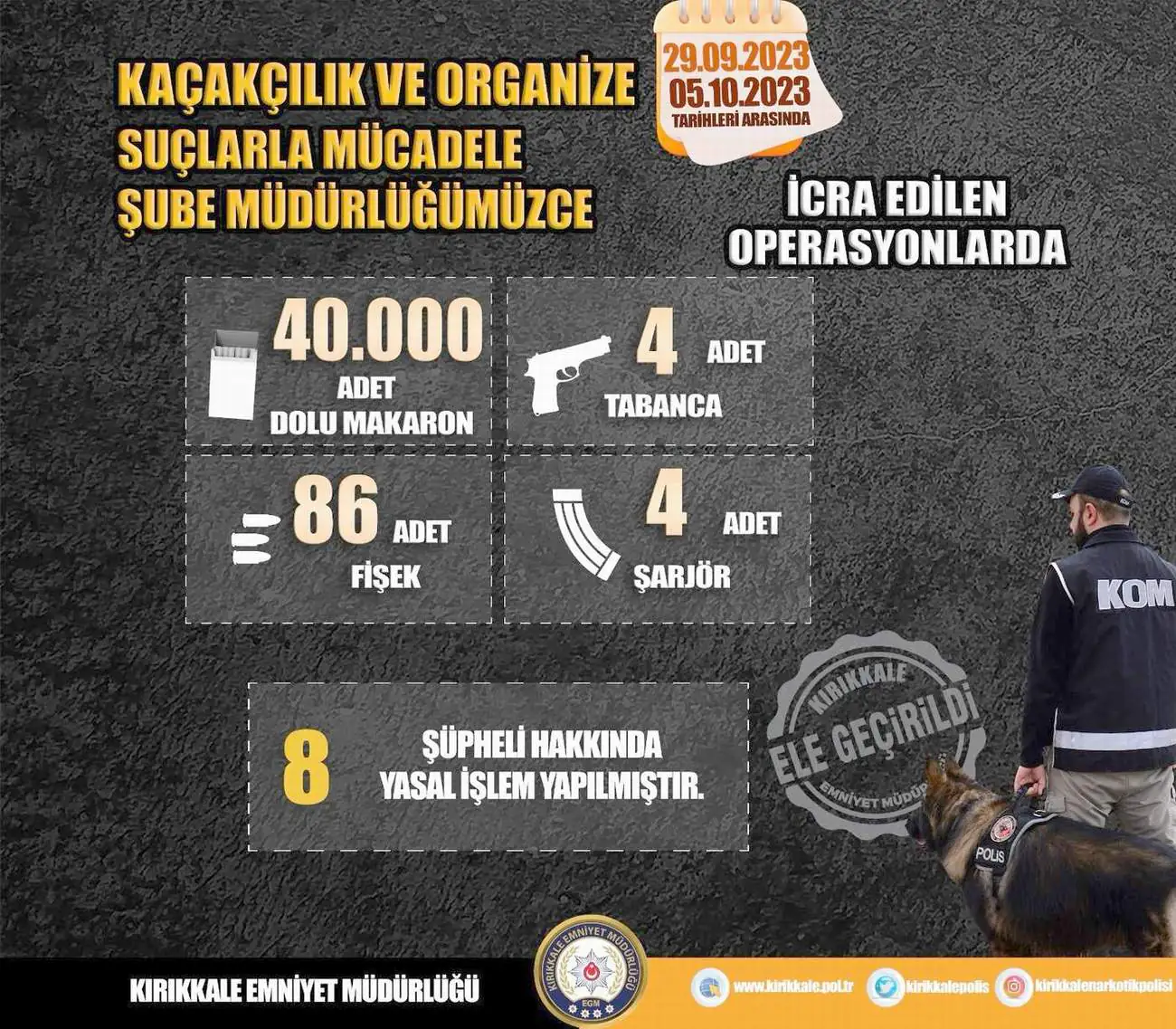 29.09.2023-05.10.2023 tarihleri arasında Cumhuriyet Başsavcılığımız koordinesinde Kaçakçılıkla mücadele kapsamında icra edilen operasyonlarda;
