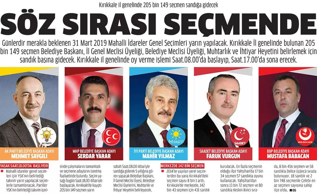 Mahalli idareler genel seçimleri için YSK’nın belirlediği takvim yarın yapılacak seçimlerle tamamlanacak. Partiler YSK’nın belirlediği takvim içerisinde çalışmalarını tamamladı ve seçmene adaylarını tanıtma faaliyetinde bulundu. Seçim yasağı bugün Saat.18.00 itibariyle başlayacak. Kırıkkale’de kayıptı 205 bin 149 seçmen yarın sabah Saat.08.00 itibariyle sandığa giderek 5 yıllığına görev yapacak Belediye Başkanı, İl Genel Meclisi Üyesi, Belediye Meclisi Üyelerini, Muhtarlık ve İhtiyar Heyetini belirleyecek.