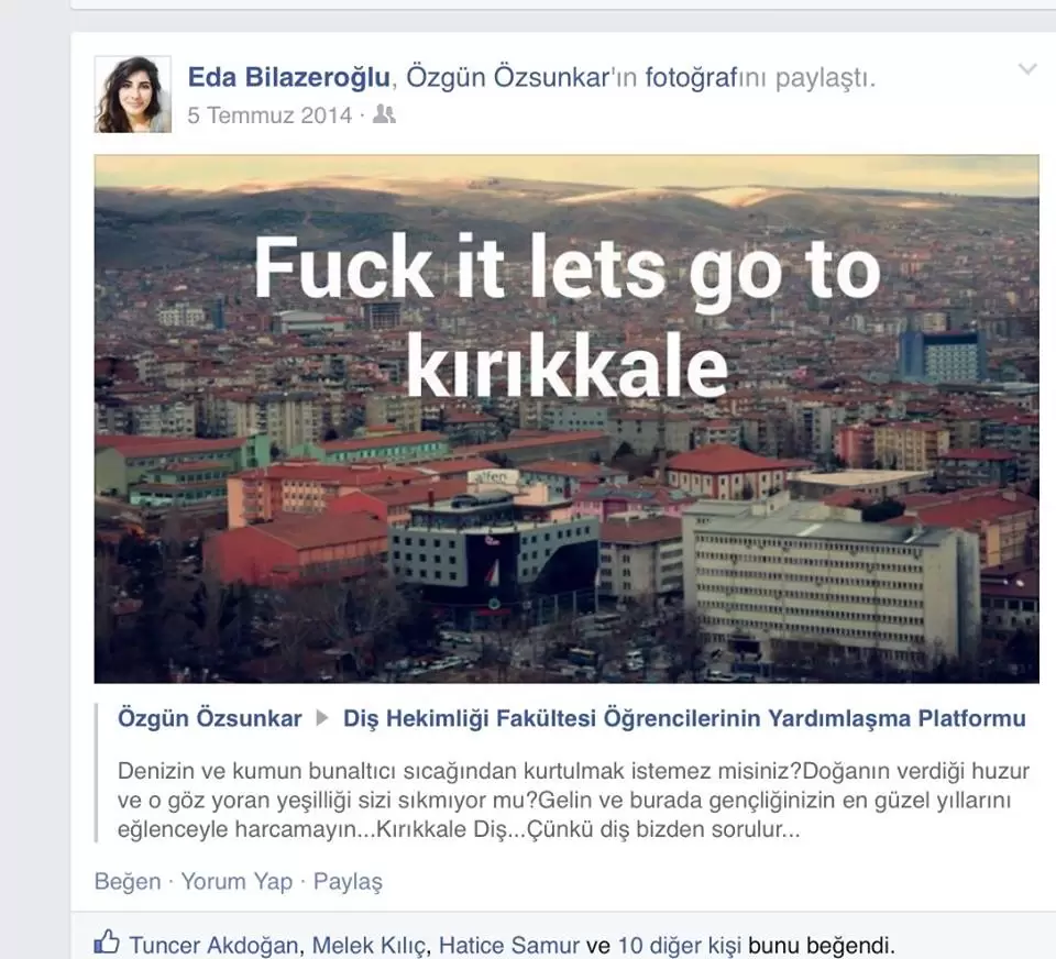 Tüm Türkiye’deki Diş Hekimliği Fakültesi öğrencileri tarafından sosyal paylaşım sitesi “Facebook”ta kurulan “Diş Hekimliği Fakültesi Öğrencilerinin Yardımlaşma Platformu”nda paylaşılan bir fotoğraf görenleri hayrete düşürdü. İngilizce argo bir ifadeyle süslenmiş(!) Kırıkkale fotoğrafının büyük beğeni ve yorum almasının yanı sıra beğenenler arasında Kırıkkale Üniversitesi Diş Hekimliği Fakültesi Dekanı Prof. Dr. Ali Erdemir’in de bulunması Diş Hekimliğinde “Kırıkkale Düşmanlığı Platformu” mu oluşturuluyor? sorusunu akıllara getirdi.
