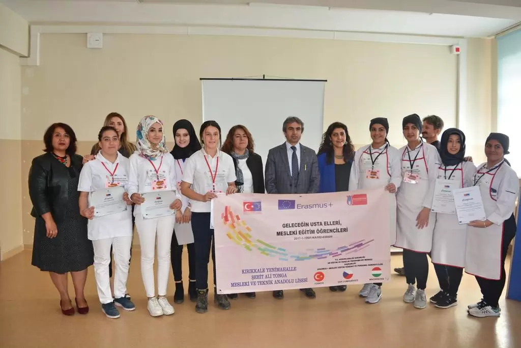 Yenimahalle Şehit Ali Tonga Mesleki ve Teknik Anadolu Lisesi tarafından 2017 yılı teklif çağrısı dönemi Erasmus+ Mesleki Eğitim Öğrenci ve Personel Hareketliliği faaliyeti kapsamında sunulan ve Ulusal Ajans tarafından kabul edilen 2017-1-TR01-KA102-038606 numaralı “Geleceğin Usta Elleri, Mesleki Eğitim Öğrencileri” adlı Avrupa Birliği projesinin yurt dışı faaliyetlerinin başarılı bir şekilde tamamlanmasını takiben proje kapanış ve sertifika verme töreni gerçekleşti. Törene Kırıkkale İl Milli Eğitim Müdürü Yusuf Tüfekçi, İl Milli Eğitim Müdür Yardımcıları, Şube Müdürleri, Okul Müdürü Hatice Özdemir, Müdür Yardımcıları, çeşitli okullarının idarecileri, Proje Koordinatörü Neslihan Uluyüz, hareketliliklere katılan refakatçi öğretmenler Filiz Kaldırım, Şebnem Güçlü, Serkan Özcan, öğrenciler ve okul öğretmenleri katıldılar. Törende yurt dışı hareketliliğe katılan öğrenciler, yaptıkları staj sayesinde edindikleri yeterlilikleri sergileyerek misafirlere yaptıkları pasta ve çikolatalardan ikramda bulundular.