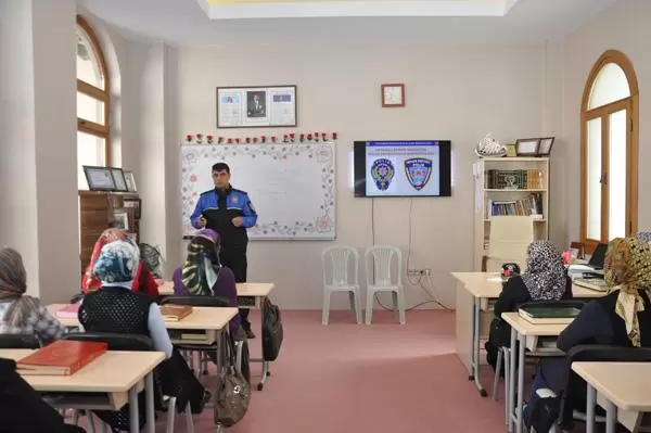 Kırıkkale Emniyet Müdürlüğü’nün başlattığı “Güvenlikte Kadın Eli Projesi” kapsamında Kur’an kursunda eğitim gören kadınlara hırsızlık, dolandırıcılık ve diğer güvenlik tedbirleriyle ilgili bilgi verildi.