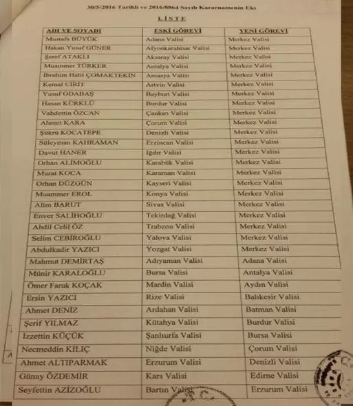 İçişleri Bakanlığı’nın yayımladığı Valiler Kararnamesi’ne göre; 22 vali merkeze alındı, 24 ile yeni vali atandı. İçişleri Bakanlığı’nın Valiler Kararnamesi Resmi Gazete’de yayımlandı. Buna göre; 22 vali merkeze alındı, 24 ile yeni vali atandı. 26 il valisi de kendi içerisinde yer değiştirdi.Kısa süre önce vekaleten atanan.Mükerrem Ünlüerin yerine T.C. İçişleri Bakanlığı AB ve Dış İlişkiler Dairesi Başkanı Dr. M. İlker Haktankaçmaz atandı…