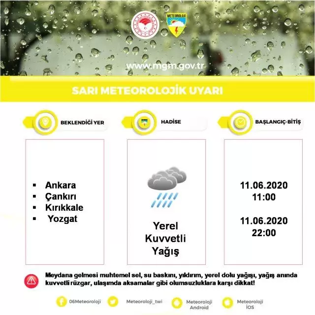 Orta Karadeniz’in iç kesimleri, İç Anadolu’nun kuzeyi ve Marmara’nın güney ve batısında yarın yerel kuvvetli yağış bekleniyor Meteoroloji Genel Müdürlüğünden yapılan uyarıya göre, Batı ve Orta Karadeniz’in iç kesimleri (Bolu, Düzce, Karabük, Kastamonu, Çorum, Amasya, Tokat, Samsun, Sinop, Zonguldak ve Bartın illerinin iç kesimleri), Marmara’nın güney ve batısı (Bursa, Balıkesir, Edirne, Kırklareli, Tekirdağ’ın batı ilçeleri ve Çanakkale’nin doğu ilçeleri) ile İç Anadolu’nun kuzeyinde (Ankara, Çankırı, Kırıkkale ve Yozgat) yarın öğleden önce yerel olarak kuvvetli (21-50 kg/m2) sağanak ve gök gürültülü sağanak tahmin ediliyor. Meteoroloji, 20 il için kuvvetli yağış uyarısında bulundu VATANDAŞLARA ÖNEMLİ UYARI Meydana gelebilecek sel, su baskını, yıldırım, yerel dolu yağışı, kuvvetli rüzgar ve ulaşımda aksamalar gibi olumsuzluklara karşı dikkatli ve tedbirli olunması gerekiyor.