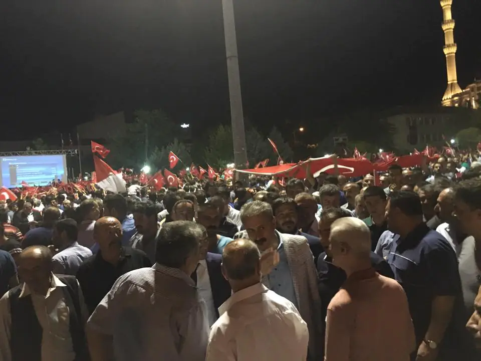 Cumhuriyet Meydanı’nda toplanan vatandaşlar, FETÖ elebaşı Fethullah Gülen’in posterlerini yakıp, sloganlarla darbe girişimini protesto etti. Programda, İl Müftülüğü tarafından görevlendirilen din görevlileri, Kur’an-ı Kerim okuyarak dualar etti. Toplanan binlerce kişi ellerinde Türk bayraklarıyla darbe girişimini protesto ederek bugün de ’Demokrasi Nöbetine’ devam etti. Kalabalık zaman zaman alanlarda meşale yaktı. Kalabalık, Cumhurbaşkanı Recep Tayyip Erdoğan’ın seslendirdiği İstiklal Marşı’nı ve Arif Nihat Asya’nın dua şiirini dinledi. Alandakiler, Mehter Marşları’na da ellerindeki bayrakları sallayarak tempo tuttu.