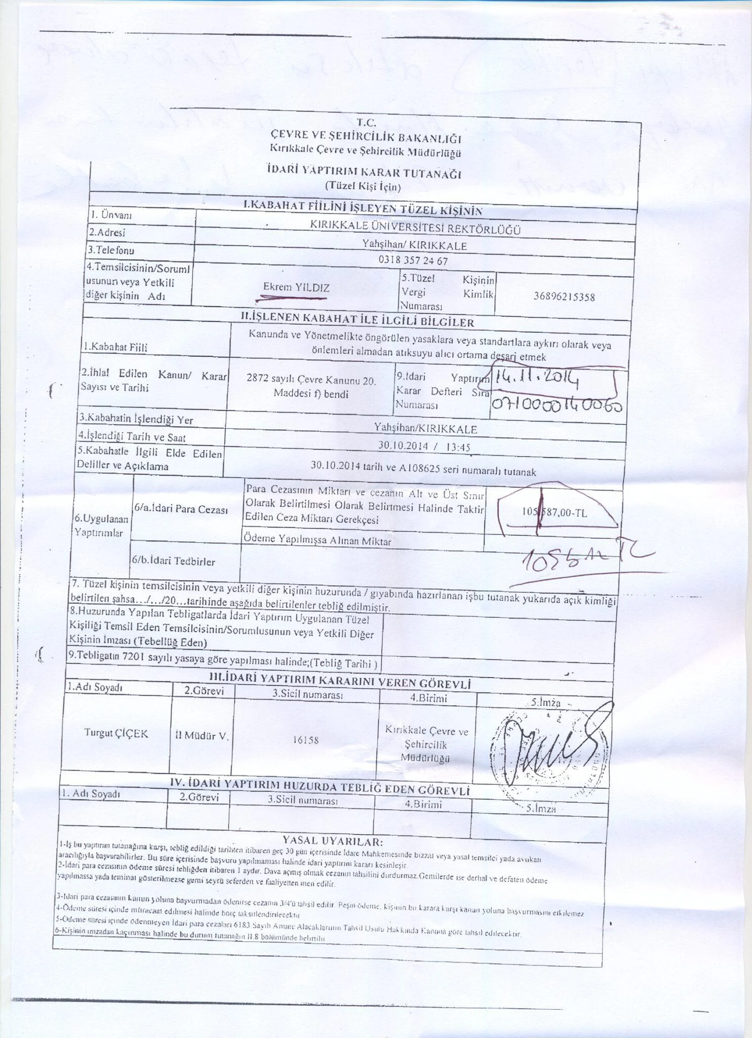 Kırıkkale Üniversitesi, kanalizasyon nedeniyle 105 bin TL ceza yedi. Ceza belgesinde kabahat fiili olarak, “Kanunda ve Yönetmelikte öngörülen yasaklara veya standartlara aykırı olarak veya önlemleri almadan atıksuyu alıcı ortama deşarj etmek” gösterildi.