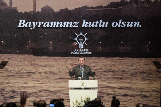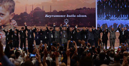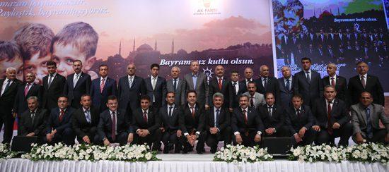 Haliç Kongre Merkezi’ndeki bayramlaşma töreni öncesinde salonda, Erdoğan’ın da forma giydiği Başakşehir Fatih Terim Stadı’nın açılışı için yapılan futbol karşılaşmasının görüntüleri izletildi. Salonda bulunanlar, Başbakan Erdoğan’ın maçta attığı golleri alkışladı. Başbakan Erdoğan, kürsüye çıktığı anda seçim şarkısı “Dombra” çalındı. Salonda bulunanlar şarkıya alkışlarla eşlik etti. Erdoğan, konuşmasının sonunda, Ak Parti’ye katılan 14 belediye başkanına rozetlerini taktı. Ak Parti’ye yeni katılan belediye başkanları, bulundukları bölgenin seçmenlerinden Başbakan Erdoğan’a selam getirdiklerini ve Erdoğan’a 10 Ağustos’ta destek vereceklerini ifade etti. Ak Parti’ye katılan belediye başkanları salonda yoğun şekilde alkışlandı. Erdoğan, program sonunda salonda bulunan 2 bin 617 kişi ile tek tek tokalaşarak bayramlaştı.
